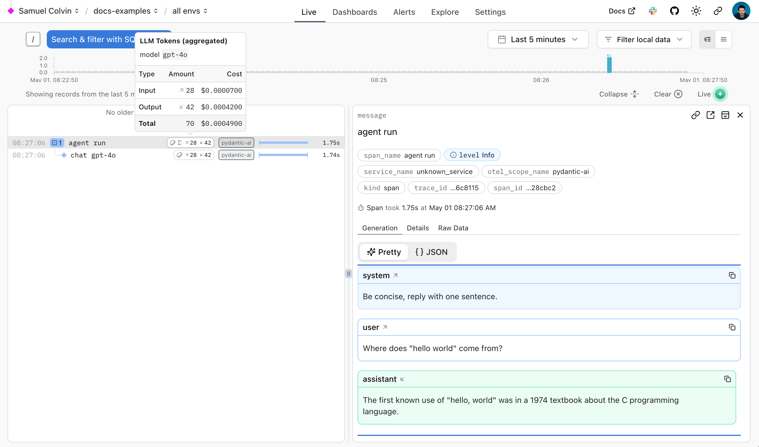 We can also query data with SQL in Logfire to monitor the performance of an application. Here's a real world example of using Logfire to monitor Pydantic AI runs inside Logfire itself: