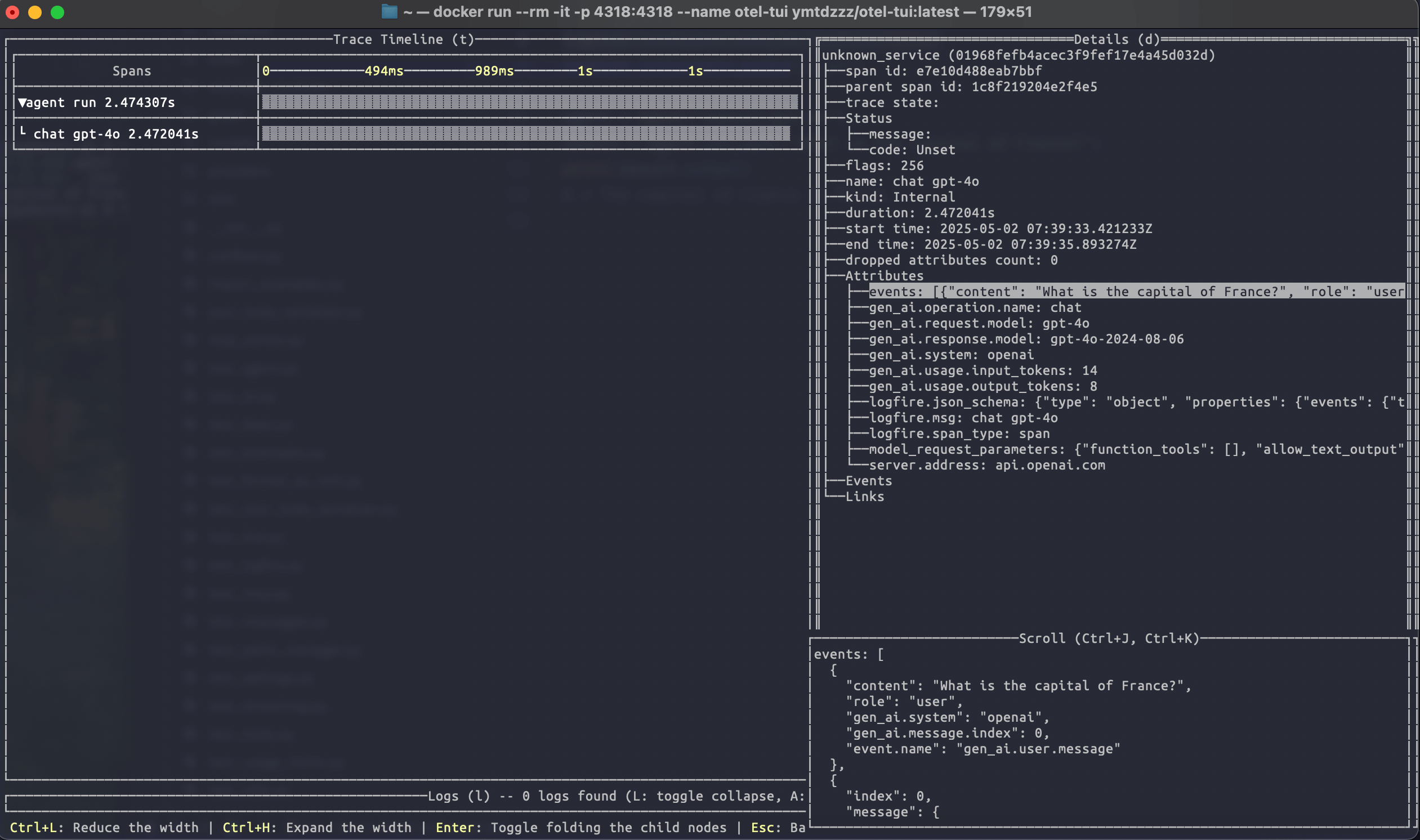 docker run --rm -it -p 4318:4318 --name otel-tui ymtdzzz/otel-tui:latest